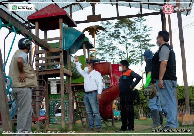 Pabel Espinoza Trujillo Alcalde de Castillo Grande junto a sus funcionarios supervisaron los juegos que beneficia a muchos infantes del parque ubicado en la plaza principal.