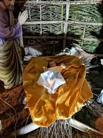 Personal de SERENAZGO con mucha fe, colocan al ENMANUEL en el pesebre de la plaza principal de Castillo Grande, a las 00 horas del 25 de diciembre